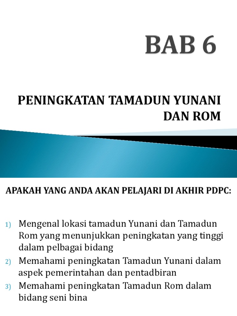 PENINGKATAN TAMADUN YUNANI DAN ROM 1 2 3 Mengenal lokasi tamadun Yunani dan Tamadun Rom yang menunjukkan peningkatan yang tinggi dalam pelbagai bidang Memahami peningkatan Tamadun Yunani dalam aspek pemerintahan dan pentadbiran Memahami peningkatan Tamadun Rom dalam bidang. This document was uploaded by user and they confirmed that they have the permission to share it. Sejarah Tingkatan 4 Bab 62 dan 63 By ednanenderd Updated.